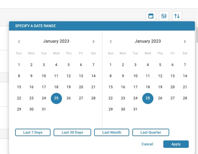 You have the option to filter by a Date range or to select a quick filter to filter to the Last 7 days, the Last 30 days, the Last Month, or the Last Quarter.