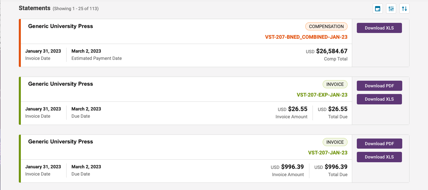 By default, 25 statements will display per page and are sorted Newest to Oldest. At the top left, you’ll see the count of the total number of statements (e.g., 113 in this example).