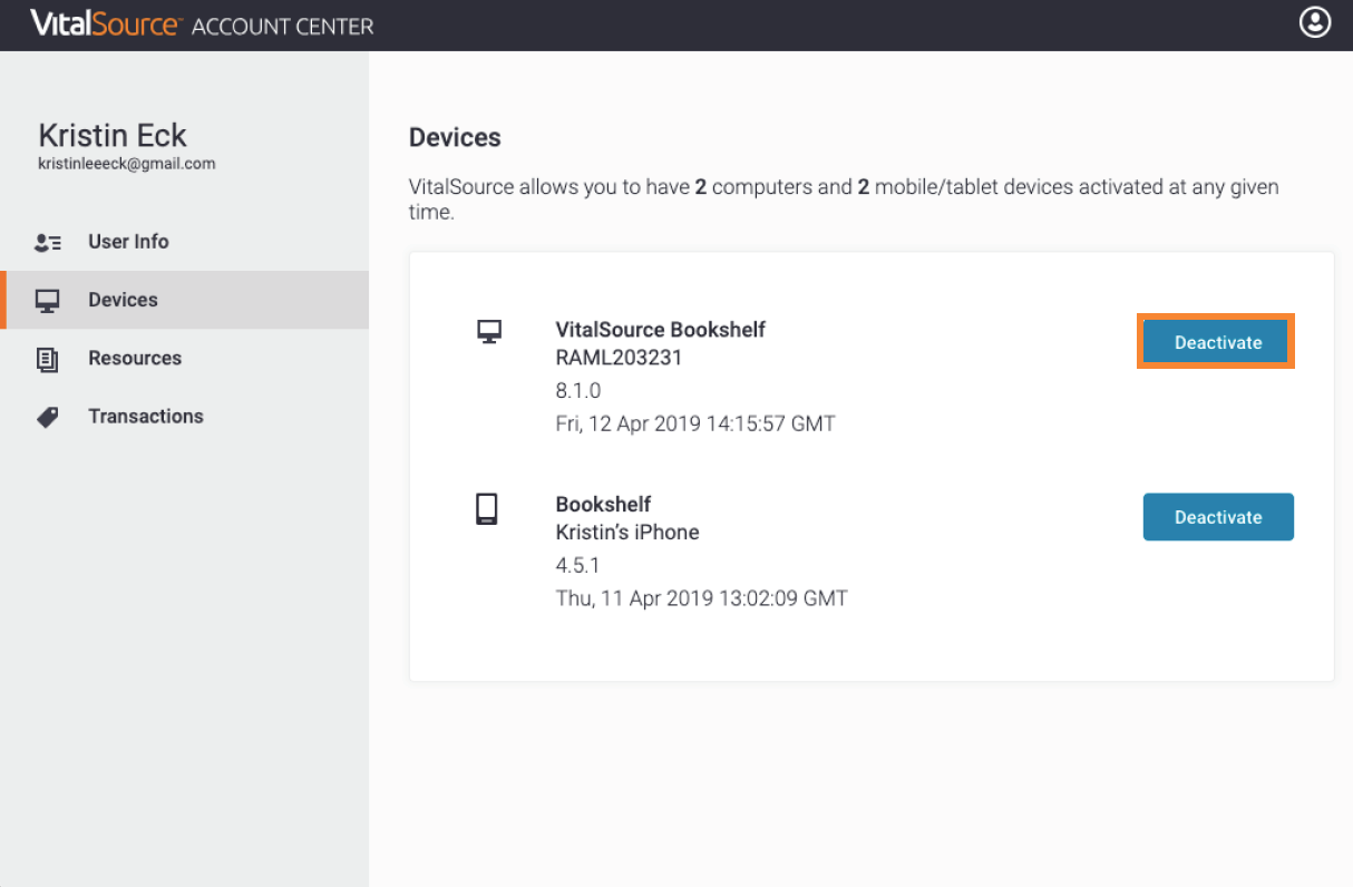 If you exceed the maximum number of device activations, you will have to deactivate a device in your Account Centre to be able to use the application on a new one. To deactivate a device, click Devices and then click Deactivate on any devices you no longer want to have your Bookshelf account associated with.