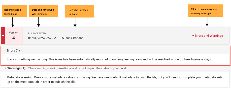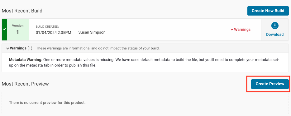 ○ Your product does not have final publication-ready metadata. (You can still build and preview without final metadata. Studio will use default metadata until the publication-ready metadata is entered.)