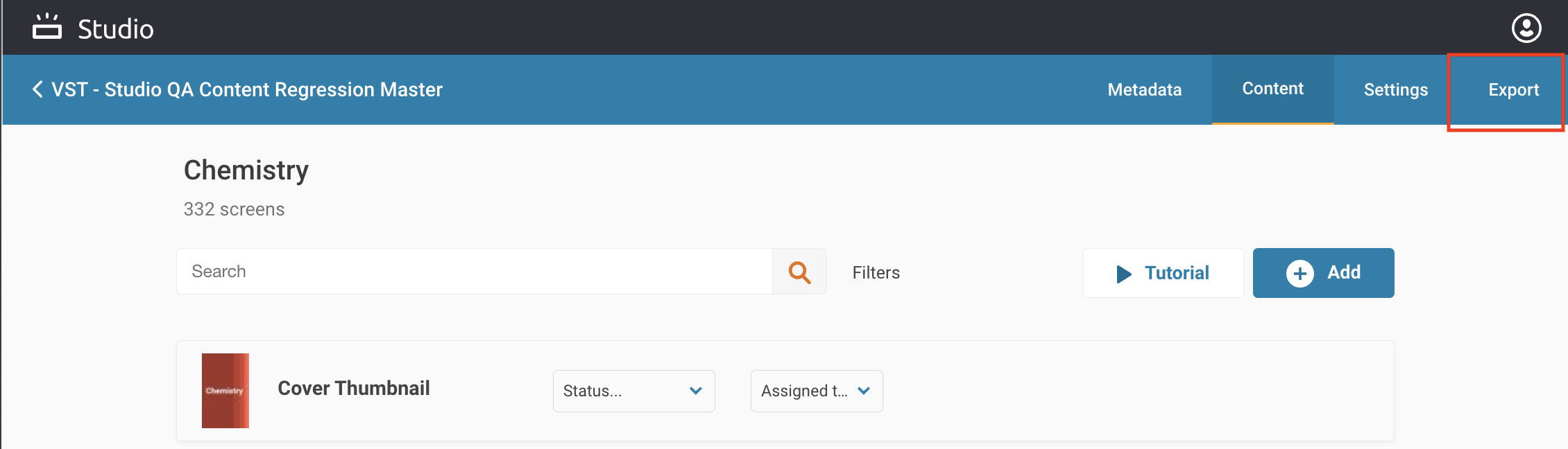 Navigate to the Export tab in Studio. The tab is visible from the table of contents of your product.
