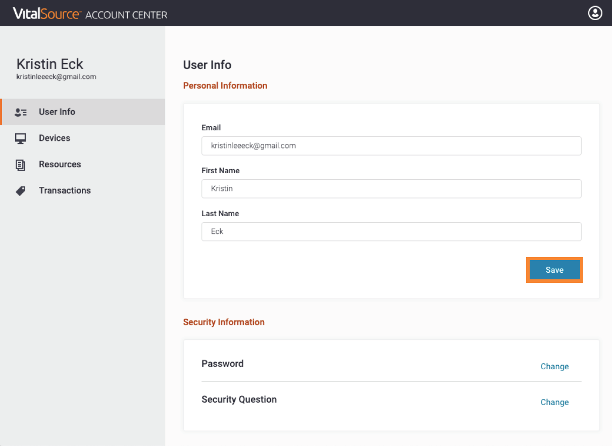 No modal Minha Conta, clique em Editar Perfil para atualizar seu nome e endereço de e-mail ou alterar a senha ou a pergunta de segurança. Você será redirecionado para myaccount.vitalsource.com para acessar o Centro de Contas. Depois de fazer as alterações, clique em Salvar.